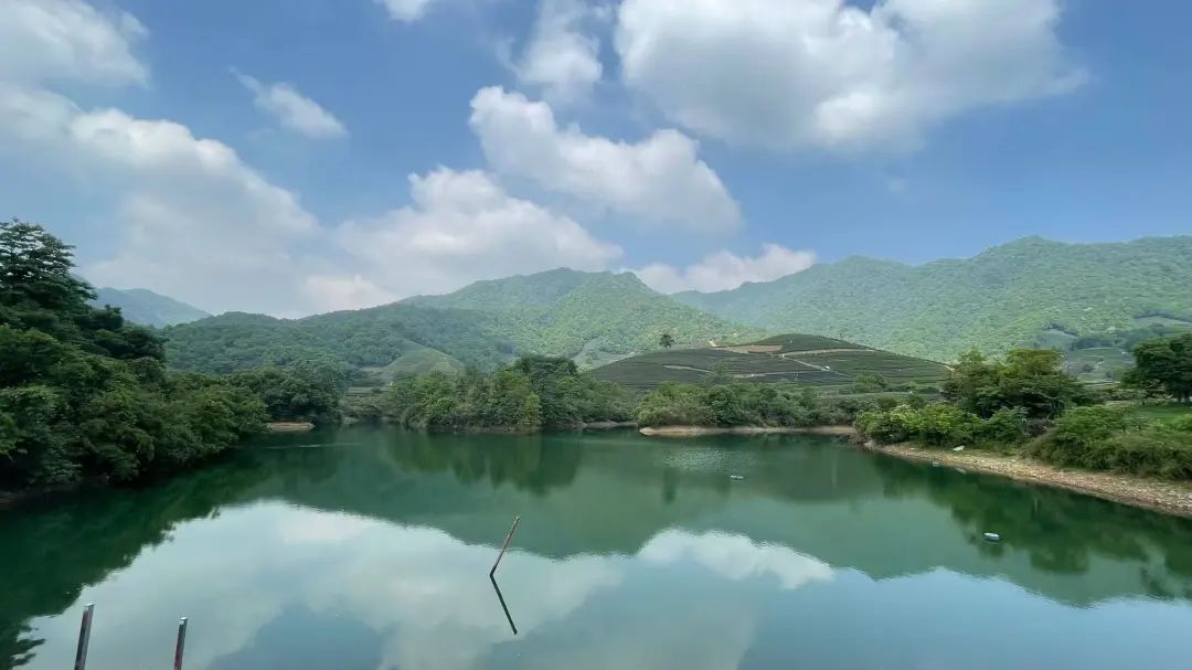 碧藍的庫水加上漫山的龍井茶,視野非常開闊。小伙伴們沿著水庫邊的臺階,拾級而上,體會碧藍的庫水和被茶山包圍的感覺。
