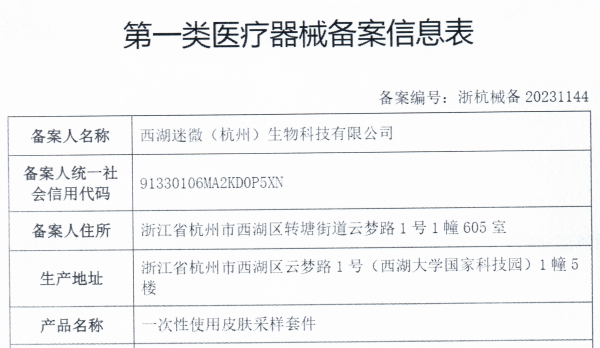 在2023年度即將完美收官之際,我公司自行研制的一次性使用皮膚采樣套件獲得杭州市市場監(jiān)督管理局的第一類醫(yī)療器械備案許可,西湖迷微首個醫(yī)療器械產(chǎn)品正式獲批上市!
