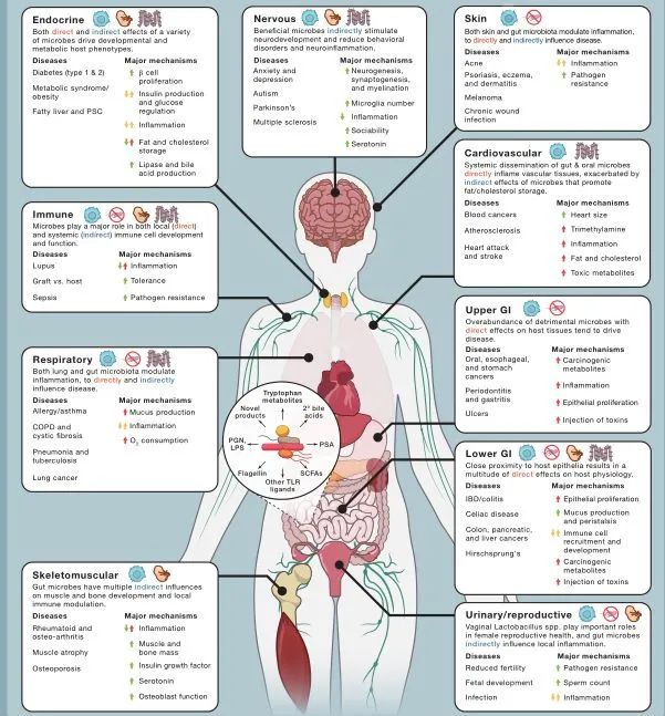 來自微生物區(qū)系的特定微生物在其表面產(chǎn)生代謝物或表達分子,這些分子可以引導(dǎo)炎癥或耐受免疫途徑。它們可以作用于這些微生物所在的局部部位,如皮膚、腸道、肺和口腔,或者對大腦、淋巴結(jié)、心臟或胰腺產(chǎn)生全身性影響。