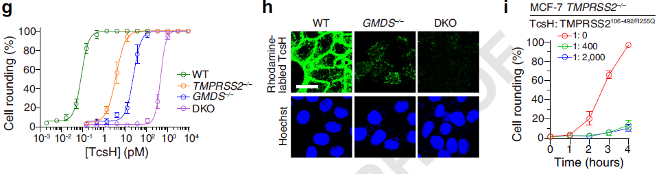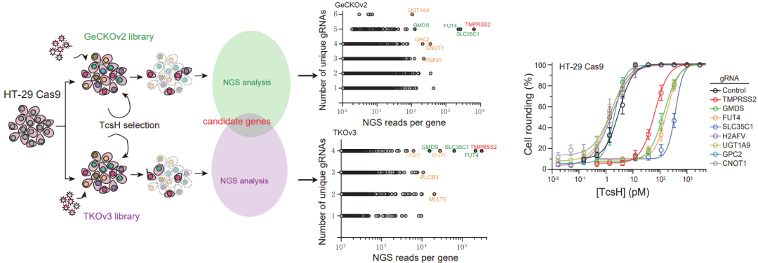 由于可參考的關(guān)于 TcsH 的先前研究相對(duì)稀少,團(tuán)隊(duì)在初期也遇到了不小的困難。其中一個(gè)難點(diǎn)就是合適的與毒素互作的靶向細(xì)胞的選擇。與其它 LCT 相比,TcsH 在很多常見細(xì)胞株上表現(xiàn)出來的毒性很弱。研究團(tuán)隊(duì)意識(shí)到篩選合適細(xì)胞系的重要性,于是測(cè)試了大量的不同組織來源的細(xì)胞系,多數(shù)人源細(xì)胞系對(duì) TcsH 都不敏感,但研究中也發(fā)現(xiàn)了兩株特定的細(xì)胞,人結(jié)腸癌細(xì)胞系 HT-29 和人結(jié)直腸癌細(xì)胞系 Caco-2,對(duì) TcsH 高度敏感。基于這一發(fā)現(xiàn),團(tuán)隊(duì)選取了 HT-29 細(xì)胞作為研究 TcsH 的模式細(xì)胞,并且為了提高成功率,選擇兩個(gè)不同來源的人源 sgRNA 文庫(kù)在 HT-29 細(xì)胞上構(gòu)建敲除文庫(kù)。通過 TcsH 壓力篩選,研究者們發(fā)現(xiàn)這兩個(gè)獨(dú)立的篩選系統(tǒng)同時(shí)富集了一系列共同的靶向基因,包括跨膜絲氨酸蛋白酶2(TMPRSS2 )及巖藻糖基化修飾相關(guān)基因 GMDS、SLC35C1、FUT4(圖1)。通過構(gòu)建基因突變和回補(bǔ)細(xì)胞,研究者們證明這些基因?qū)?TcsH 的細(xì)胞侵入起了重要作用。