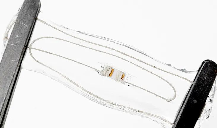 為了進(jìn)一步驗(yàn)證所開(kāi)發(fā)的嵌入式3D打印的高度自動(dòng)化程度,團(tuán)隊(duì)人員利用了業(yè)界常用的pick-and-place( 拾取—放置)方式將有源LED器件置入水凝膠支撐基質(zhì)中,并且實(shí)現(xiàn)了直接與LED連接的三維電感打印——也就是打印一個(gè)導(dǎo)電線圈,并可以利用電磁場(chǎng)接收能量,產(chǎn)生電壓,讓LED發(fā)光。通過(guò)對(duì)有源LED器件進(jìn)行表面修飾,整個(gè)器件可以產(chǎn)生強(qiáng)韌的共價(jià)交聯(lián),在一百次拉伸和壓縮大應(yīng)變情況下可保持有效工作。