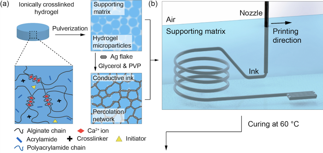 而研究團(tuán)隊(duì)把這兩種水凝膠的固化分成了兩個(gè)獨(dú)立步驟——先固化海藻酸鈣,然后再“打碎”細(xì)化成為微凝膠微顆粒。這種凝膠顆粒中除了海藻酸鈣還包含了丙烯酰胺單體、交聯(lián)劑和自由基引發(fā)劑,粒徑在20微米左右,可以作為3D打印的“墨水”。打印完成后,再通過(guò)加熱引發(fā)聚丙烯酰胺的固化,讓電子器件最終定型。