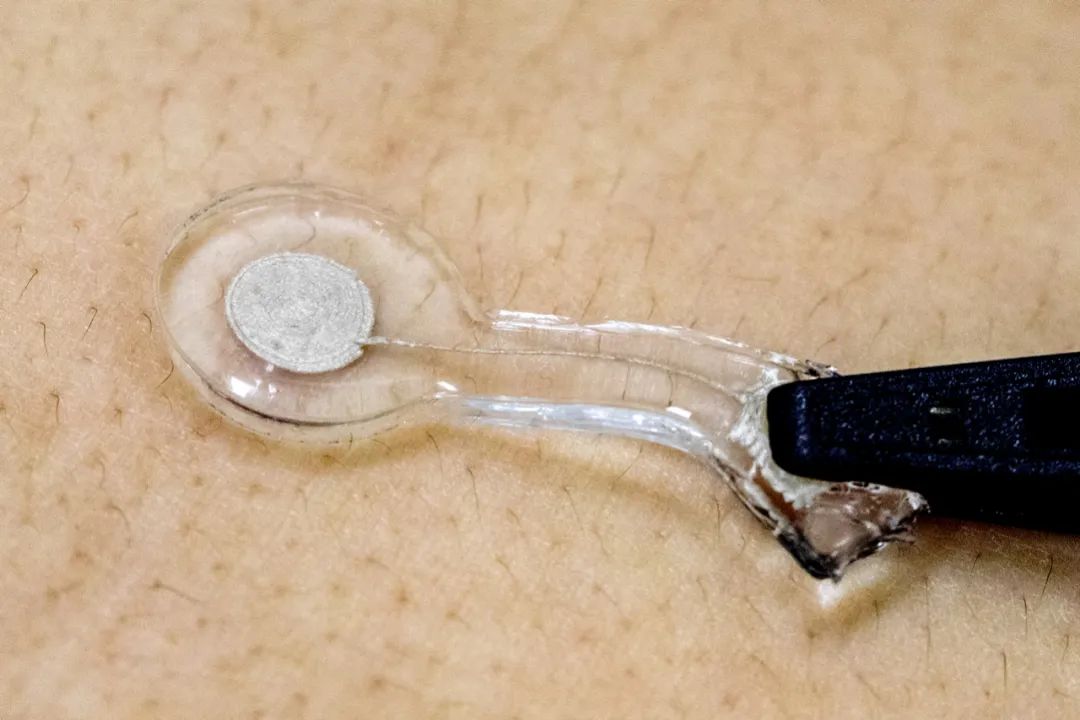 團(tuán)隊(duì)人員還利用這套方法制備了厘米尺寸的全水凝膠心電圖電極。由于水凝膠基質(zhì)和墨水良好的柔性,水凝膠電極的電子導(dǎo)電部分可以直接很好地貼敷在人體皮膚表面,從而可以有效的降低阻抗,使得3D打印電極展現(xiàn)出比傳統(tǒng)商用電極更高的分辨率。